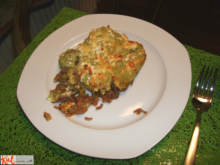 lopatko, nato brokolijev pire in na koncu posujemo z obema vrstama sira.